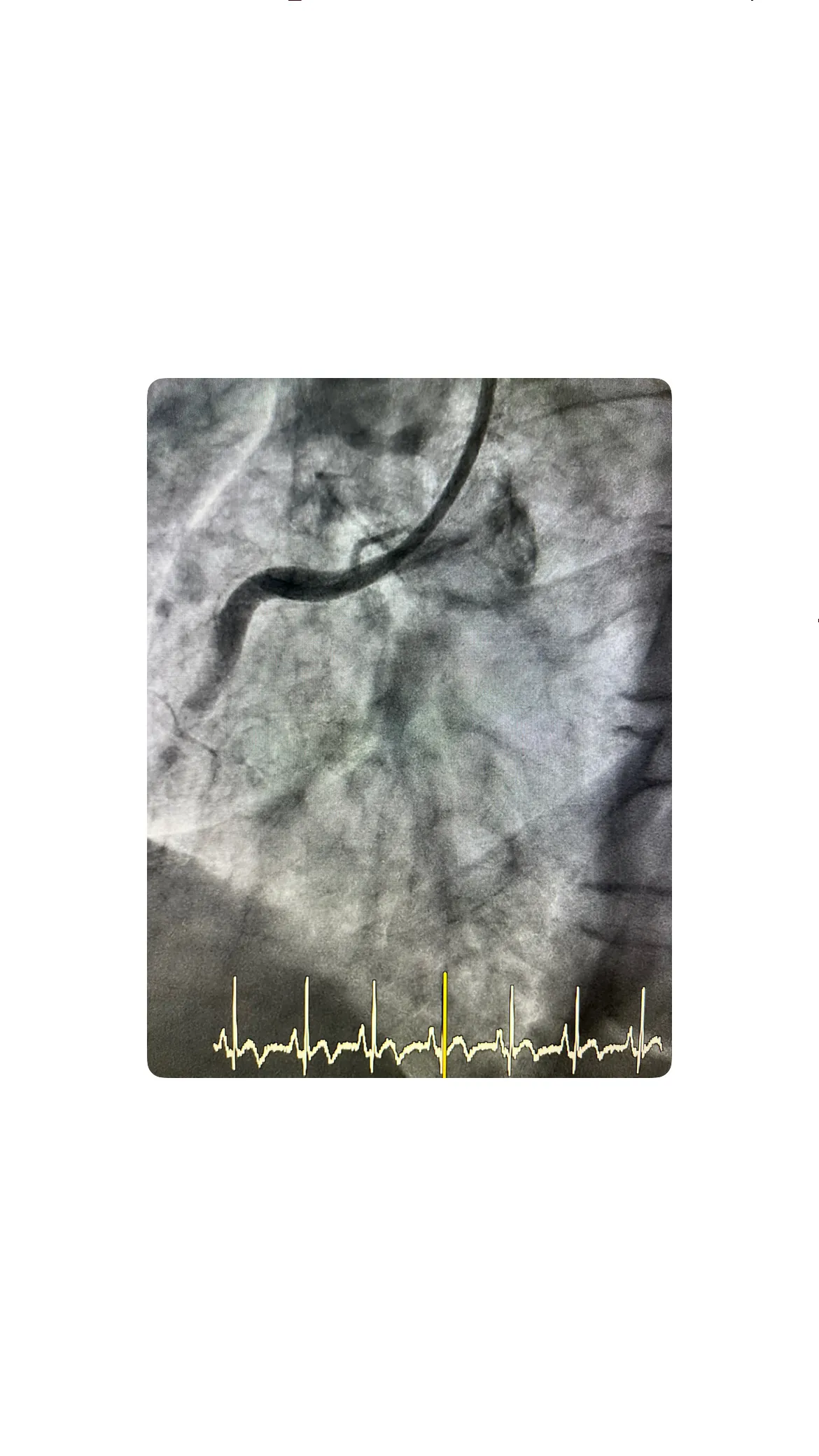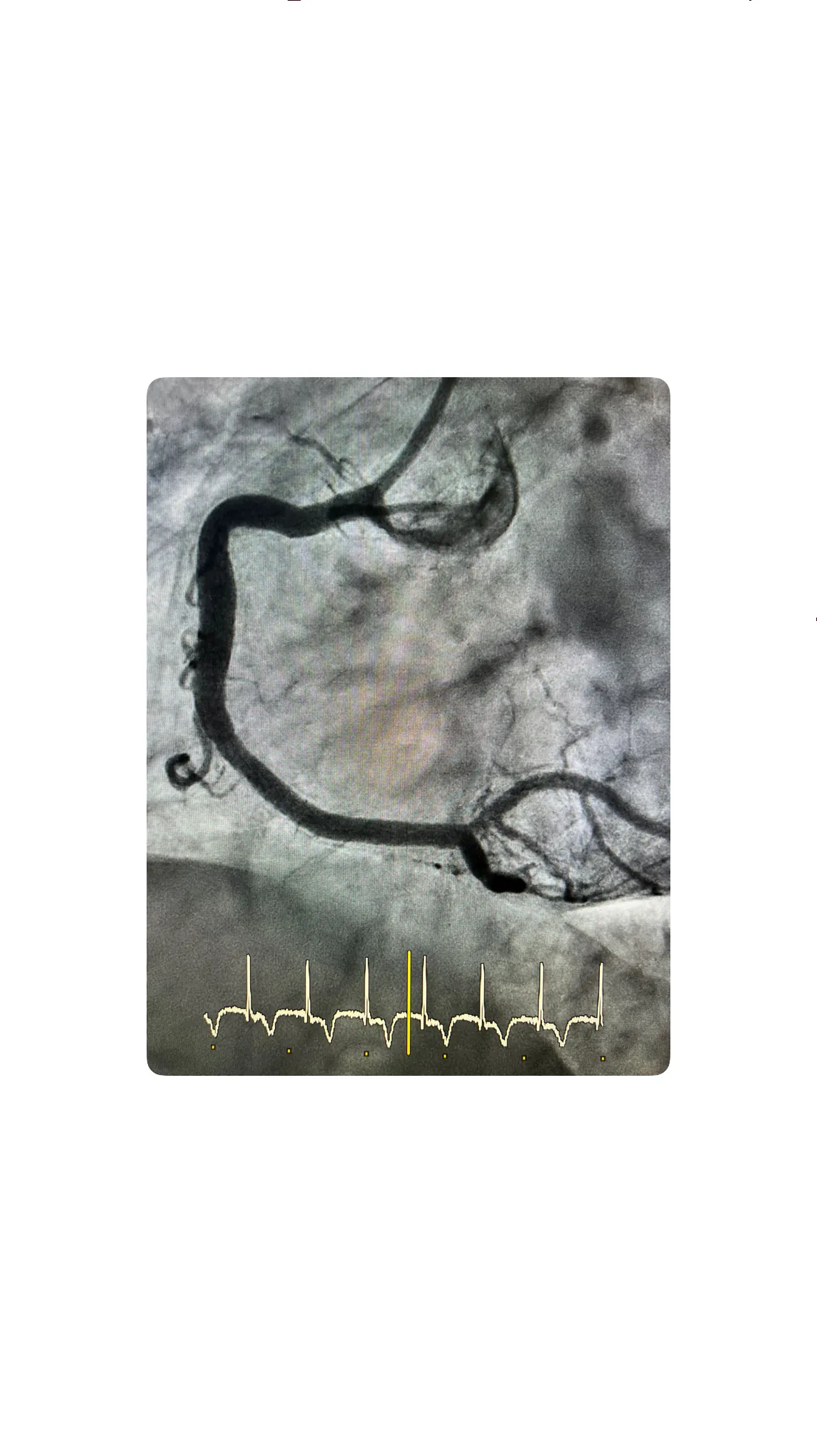 Durante el cateterismo cardíaco, el objetivo principal es identificar la arteria responsable del infarto y restaurar el flujo coronario lo antes posible. En este caso, al avanzar con el catéter y contrastar las arterias coronarias, se observa que la arteria relacionada con el territorio inferior se encuentra ocluida, lo que explica la elevación del ST en D2, D3 y aVF. Este hallazgo confirma de forma anatómica el diagnóstico de un SCACEST inferior y orienta la estrategia de revascularización hacia la apertura mecánica de la lesión mediante angioplastia.