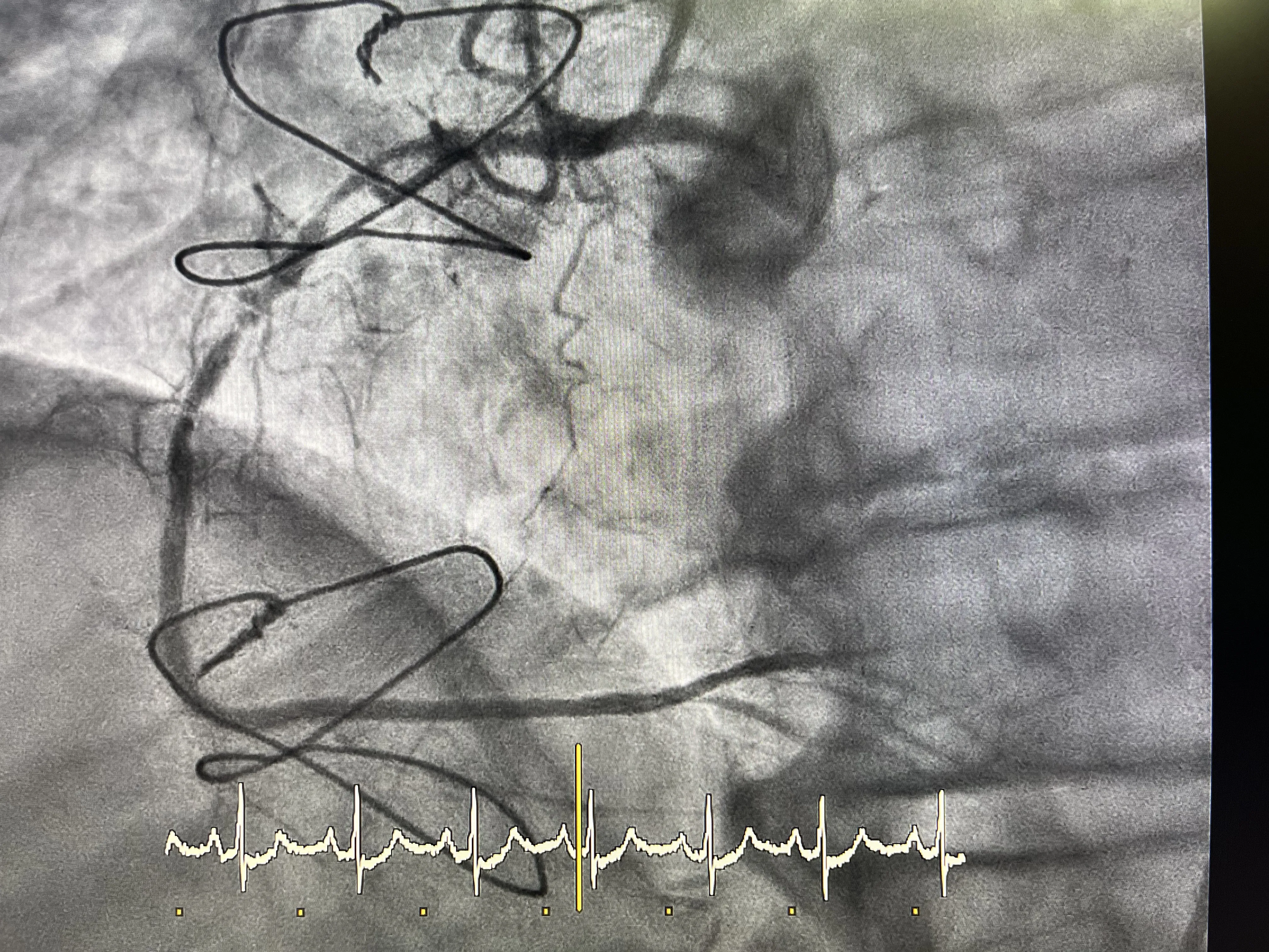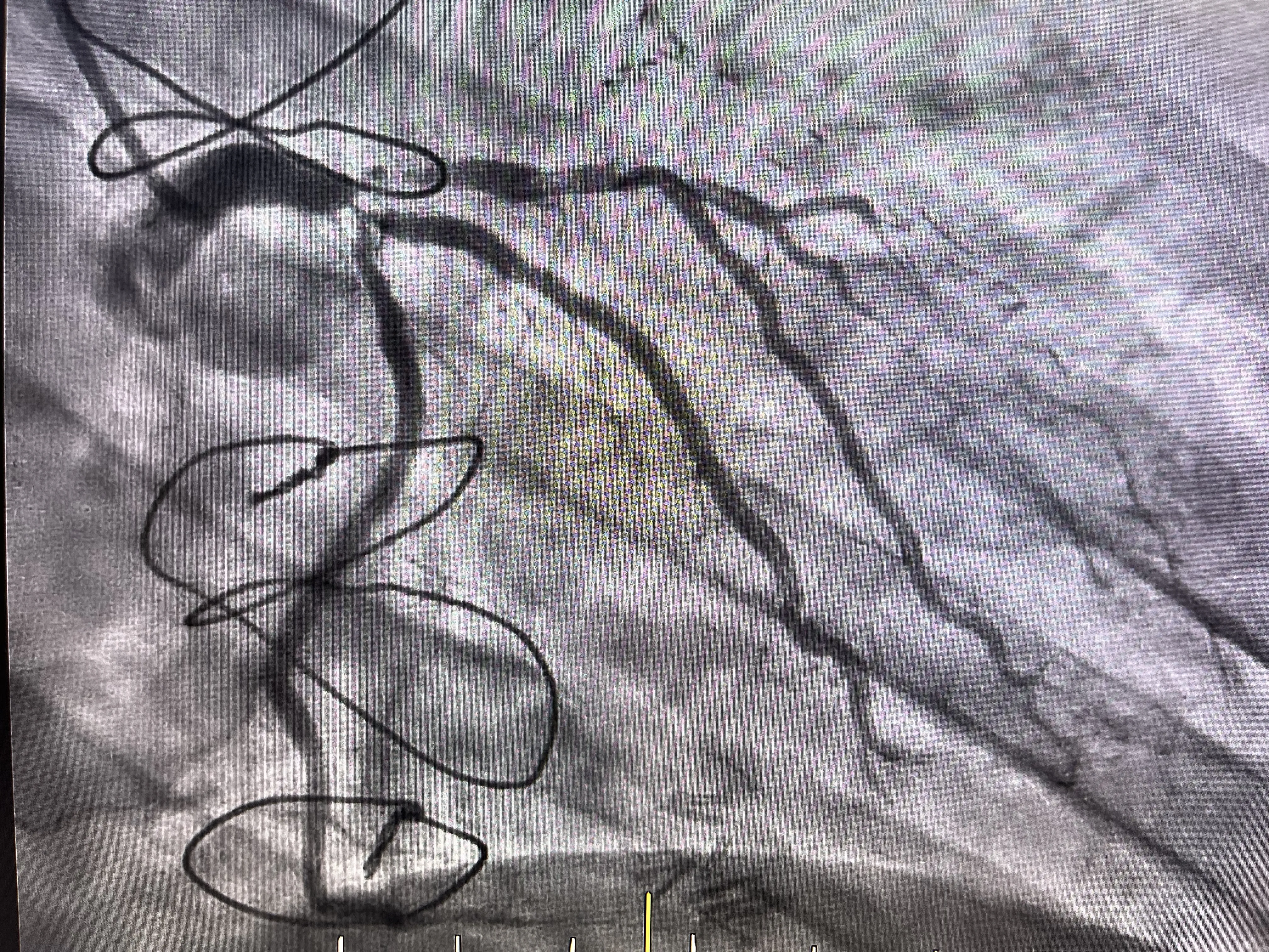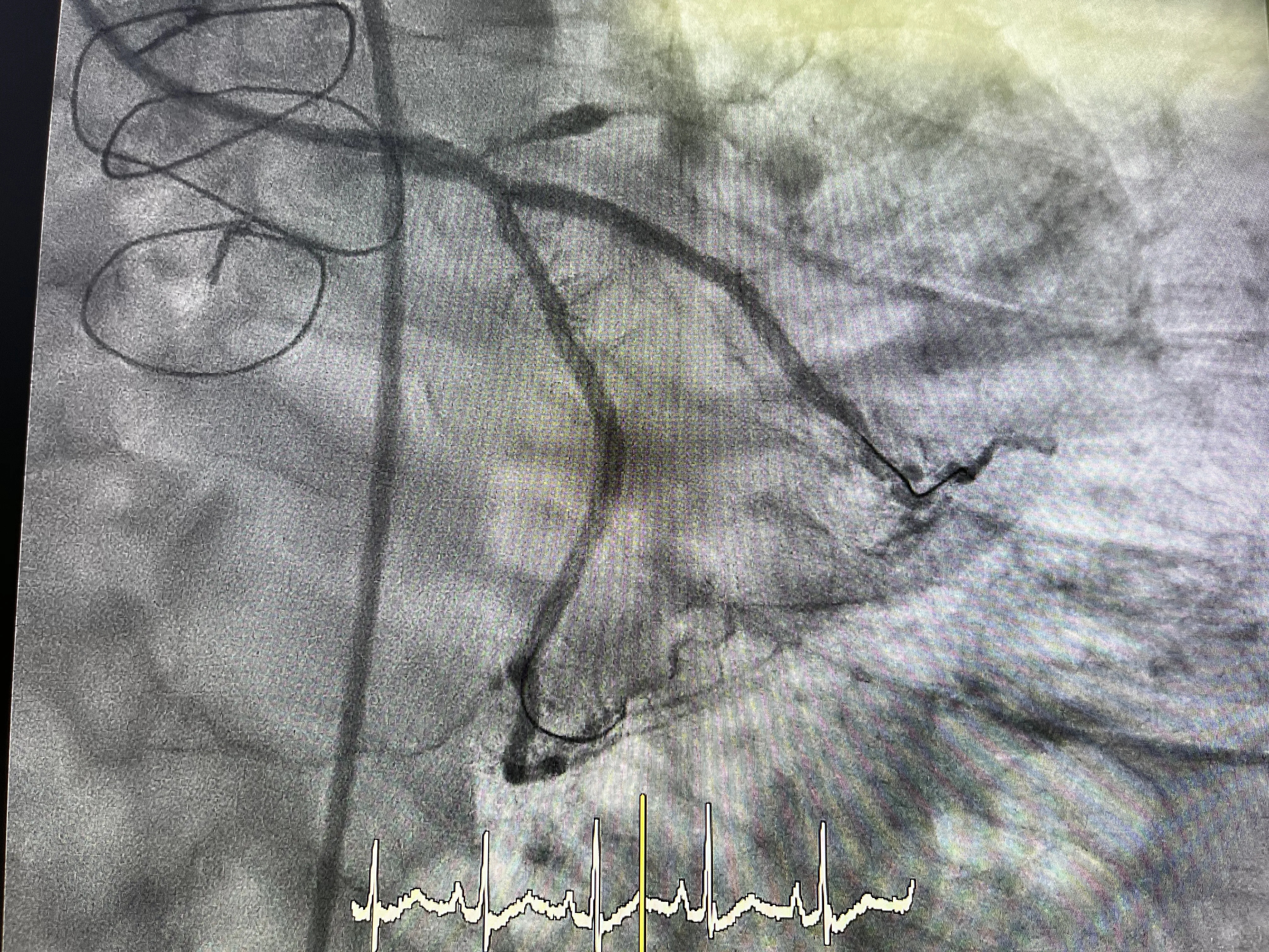 Para evaluar el estado actual del sistema cardiovascular del paciente, se realizó un cateterismo a través de la arteria radial derecha. Este procedimiento mínimamente invasivo permite obtener imágenes detalladas de las arterias coronarias y el bypass, proporcionando información crucial sobre la presencia de obstrucciones o estrechamientos que puedan estar contribuyendo a la angina inestable.