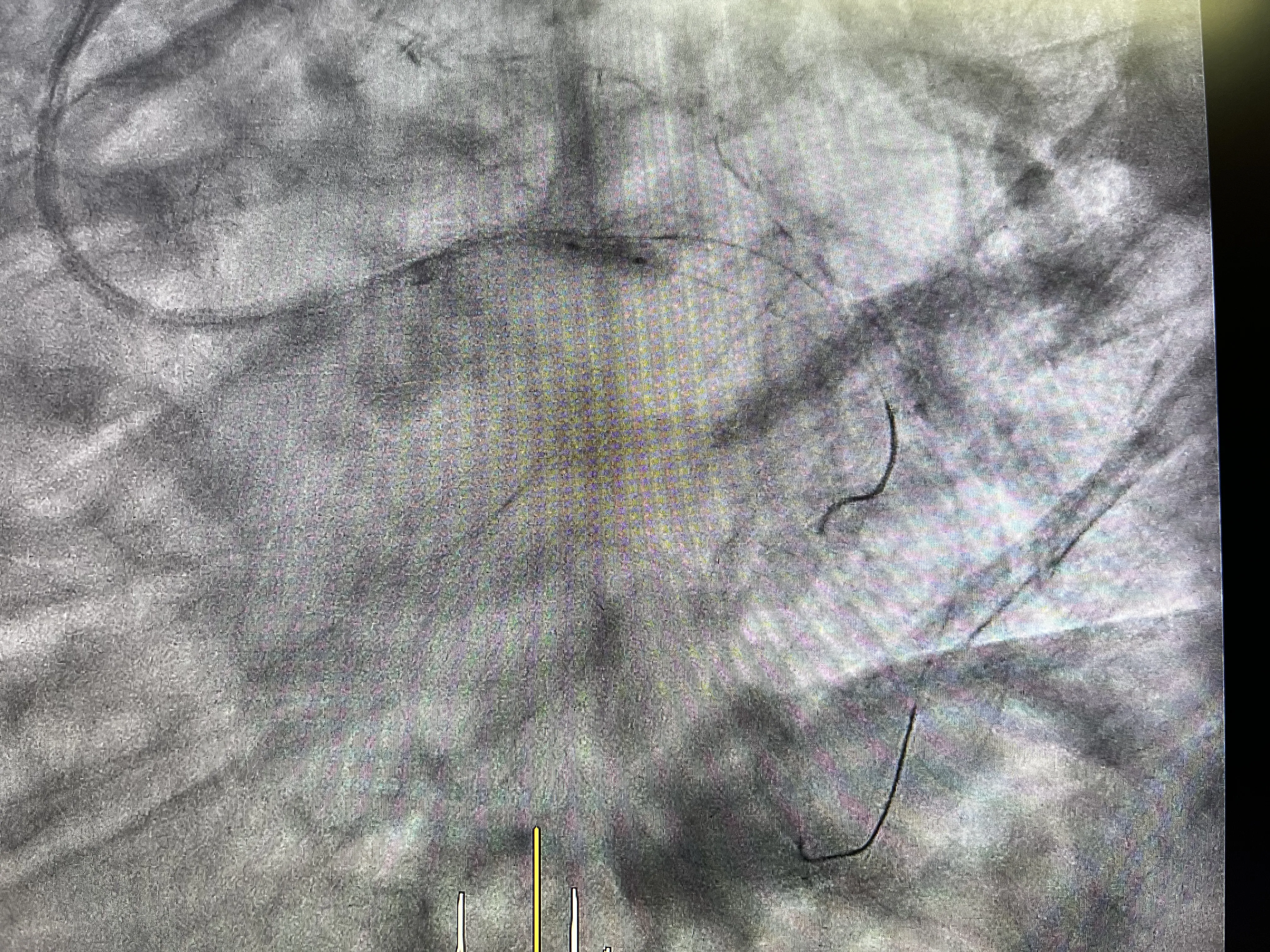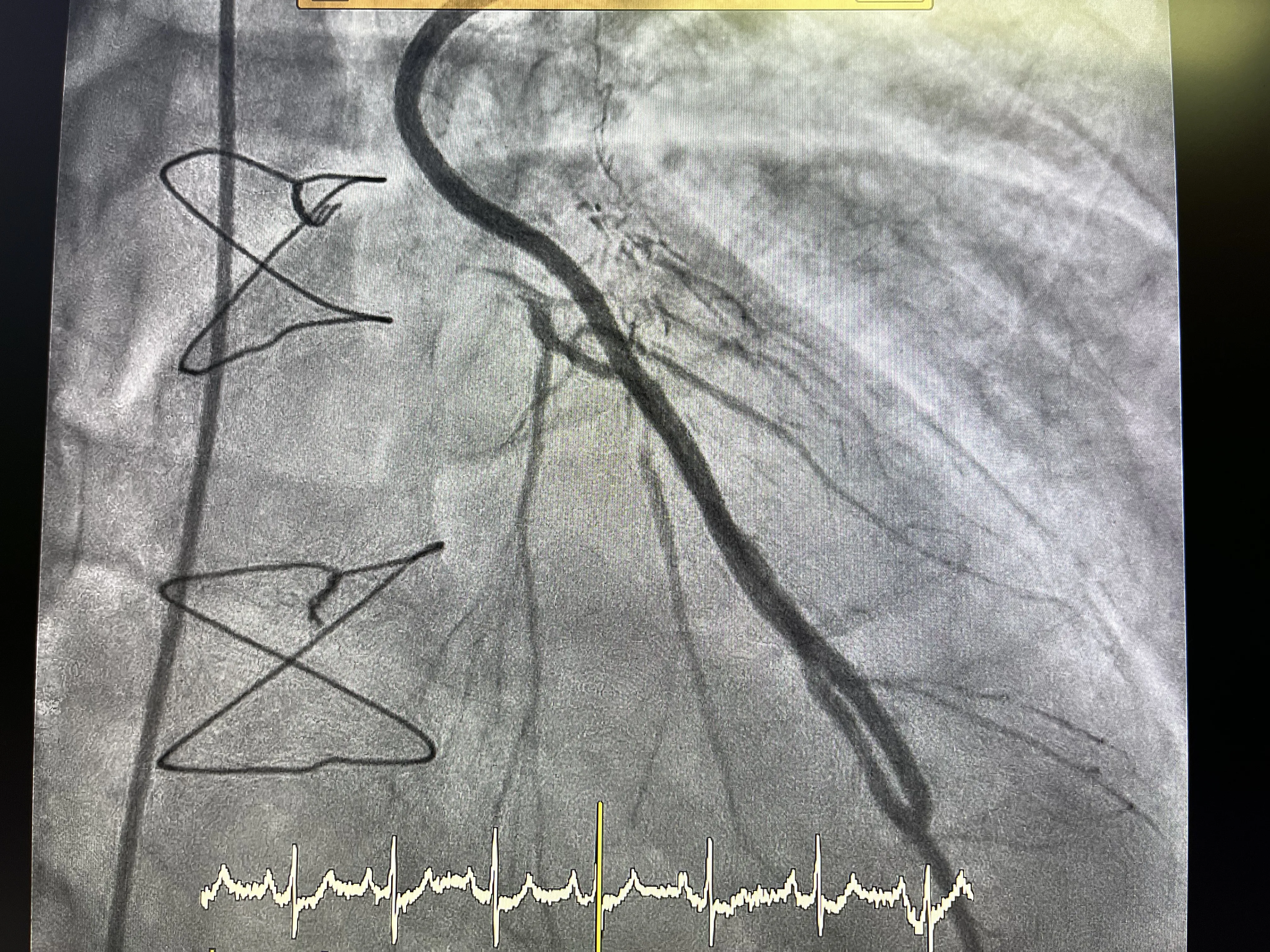 La angiografía realizada durante el cateterismo reveló que el bypass está en buen estado y cumple su función de irrigar la arteria descendente anterior. Este hallazgo es positivo, ya que indica que el bypass sigue siendo una vía efectiva para mantener el flujo sanguíneo al corazón, a pesar de las obstrucciones presentes en las arterias coronarias nativas.